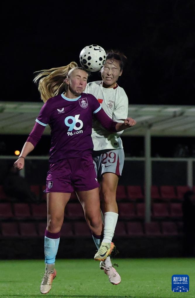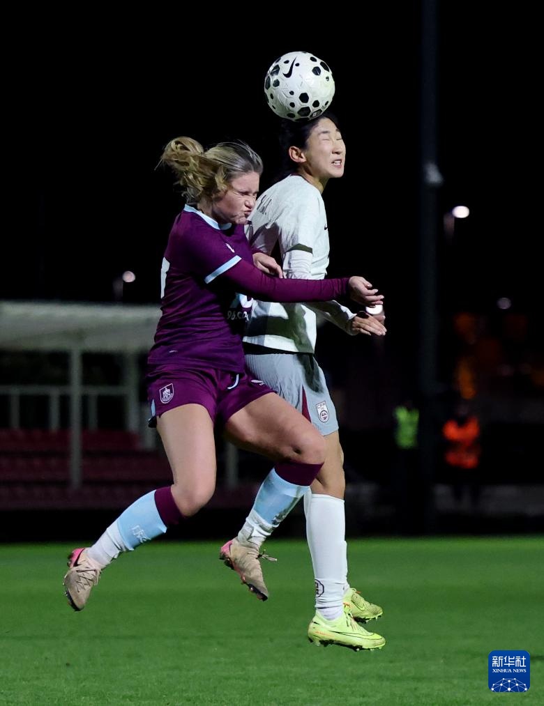 11月24日,中国队球员王妍雯(右)与伯恩利队球员争顶。新华社记者 李颖 摄