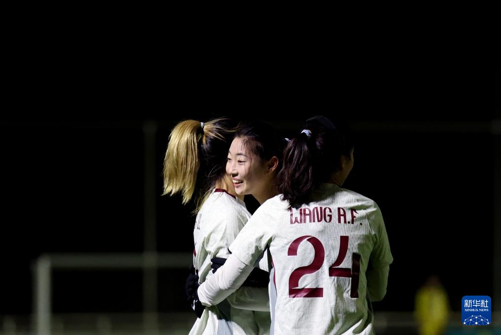 11月24日,中国队球员唐佳丽进球后与队友霍悦欣(右)庆祝。新华社记者 李颖 摄
